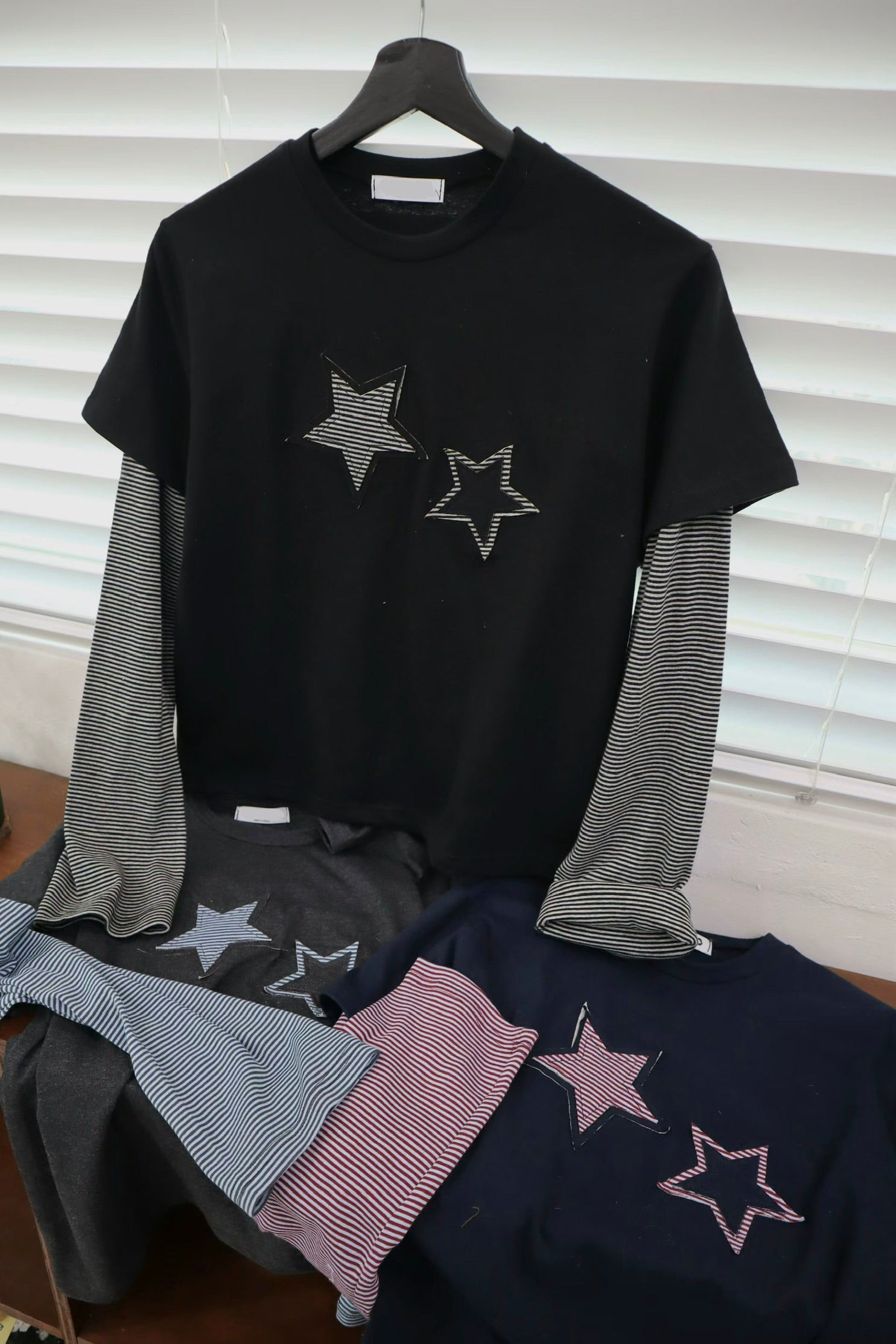 Star Striped Faux Two-piece Long-sleeved Top